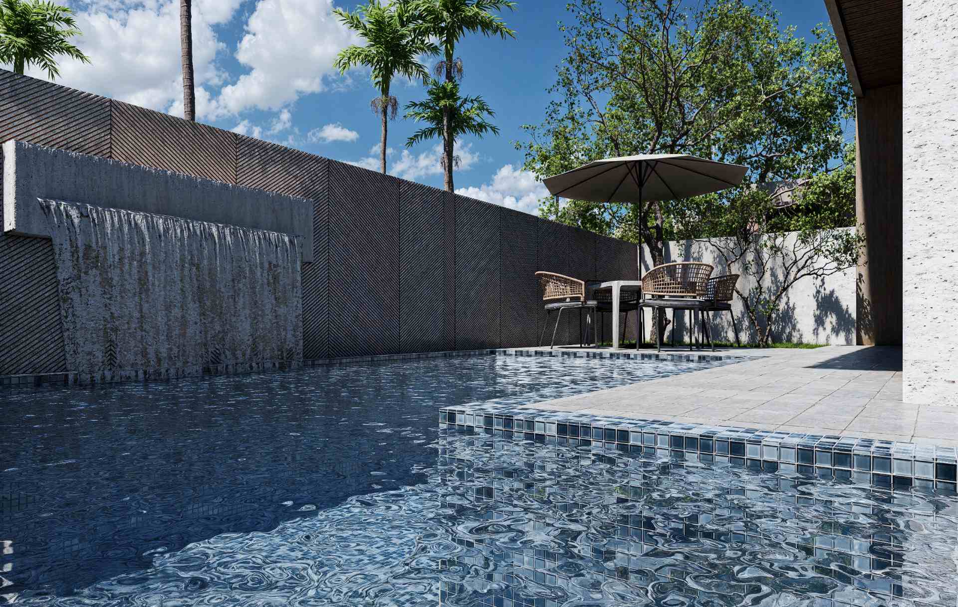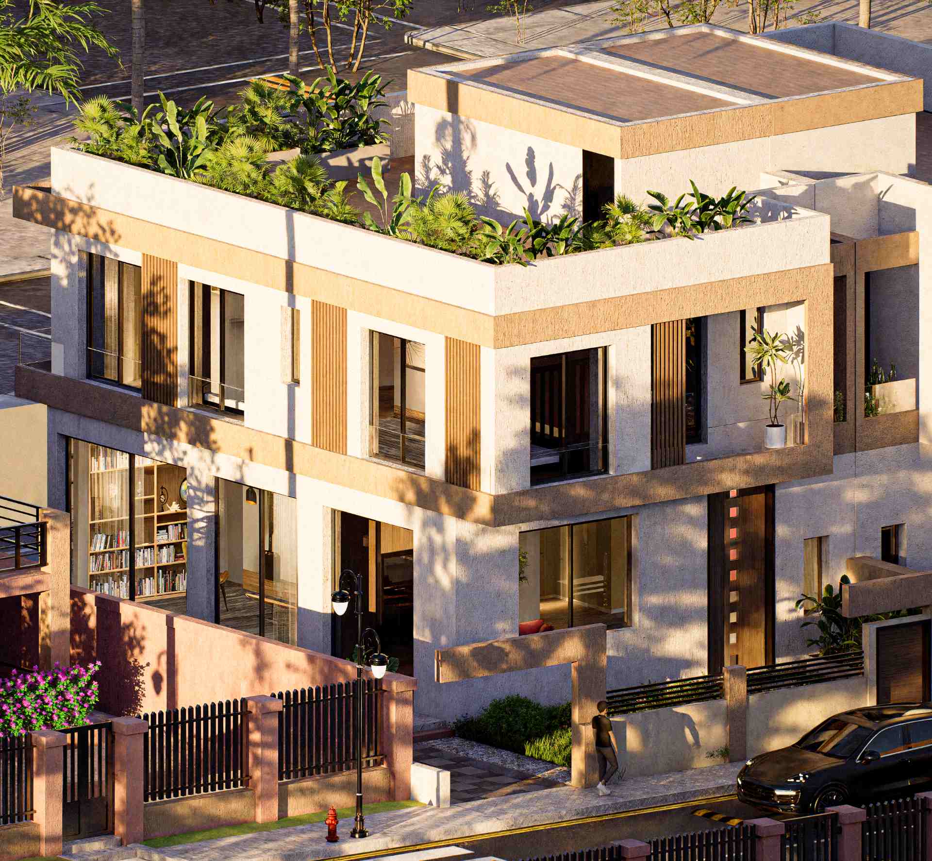 L’extérieur est sublimé par une piscine soigneusement intégrée, des espaces verts et des terrasses couvertes, créant un cadre de vie harmonieux et raffiné.